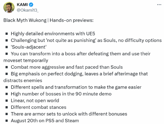 据了解,游戏《黑神话:悟空》将于8月20日正式发售并登陆本世代主机和PC平台,而游戏推主Okami13_于近期在社交平台上发布了该游戏外媒试玩体验下来的感受和游戏内容,让我们一起来看看吧。