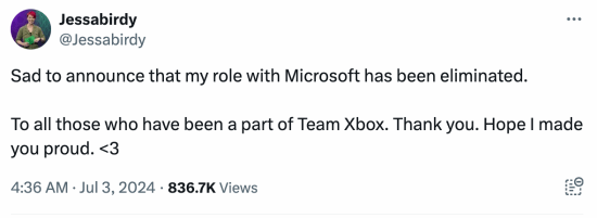 Jessabirdy在推特发文:“很遗憾宣布我在微软的职位已被取消。致所有Xbox团队的成员,谢谢,希望我能让你们感到骄傲。”