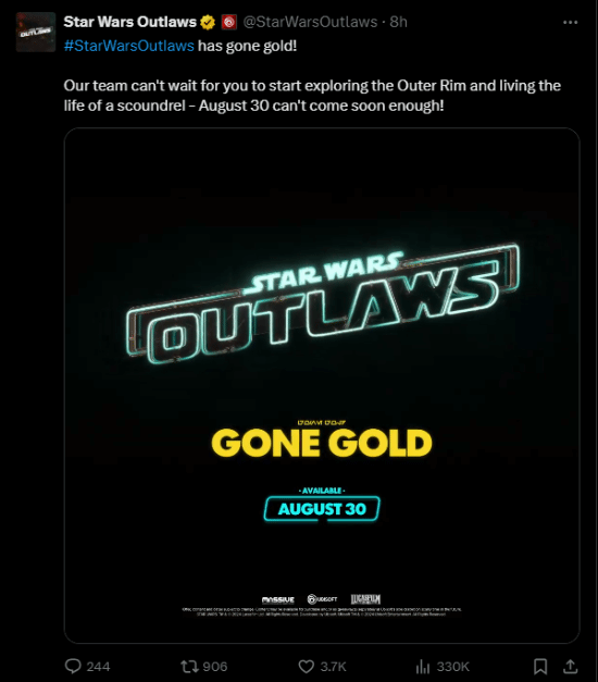 据了解,育碧旗下《星球大战:亡命之徒》将于8月30日正式发售并登陆PS5、Xbox Series X/S和PC平台,并在未来几个月的时间内推出两个扩展包,而育碧官方也于近期在社交平台上宣布,该游戏已开发完毕,进厂压盘。