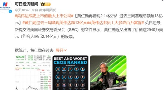 据英伟达于近日提交给美国证券交易委员会的最新文件显示,黄仁勋近又出售了价值逾2940万美元(约合人民币2.14亿元)的股票,据统计,黄仁勋在过去三周已经减持该公司144万股股份,总额达到1.84亿美元(约合人民币13.38亿元)。