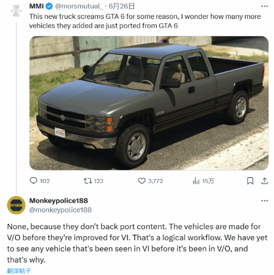 Monkeypolice188曾针对GTAOL中出现《GTA6》车辆的问题表示,“这些车辆是为了GTAOL或本体制作的,然后在《GTA6》上进行改进,我还没有看到任何在GTAOL或本体出现之前,就在《GTA6》中出现的车辆,这就是原因。”