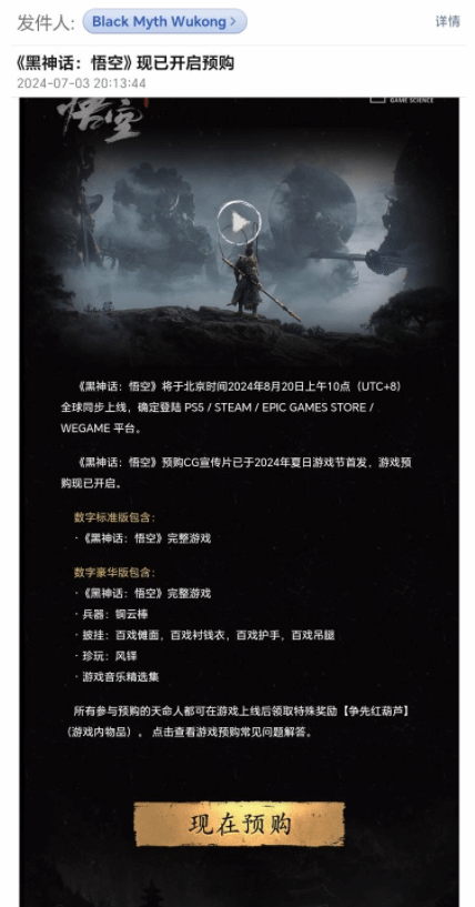 据了解,游戏《黑神话:悟空》将于8月20日正式发售,而据相关消息,有玩家于近期表示,其收到了《黑神话:悟空》官方发出的宣传邮件,提醒预购游戏。该作将于8月20日上午10点,全球同步上线,登陆PS5、Steam、Epic和WeGame平台,让我们一起来看看官方发布的原文吧。