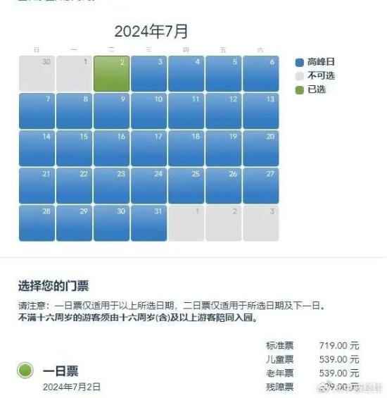 据相关消息,有网友于近期在社交平台上发帖表示,上海迪士尼景区从7月1号开始涨价到719元,而这个帖子引发网友围观和热议,对此,迪士尼客服工作人员于7月2日表示,719元的门票(一日票)属于“高峰日”价格,涵盖了夏季大部分日期和部分节假日。