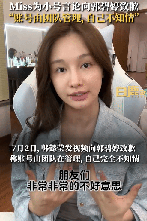 韩懿莹在视频中称自己每天打游戏只睡4个多小时,期间屏蔽了很多媒体信息,账号由团队在管理,对此事完全不知情。在评论区看到网友讨论才得知这件事,第一时间向郭碧婷表达了歉意,个人也进行了反思。