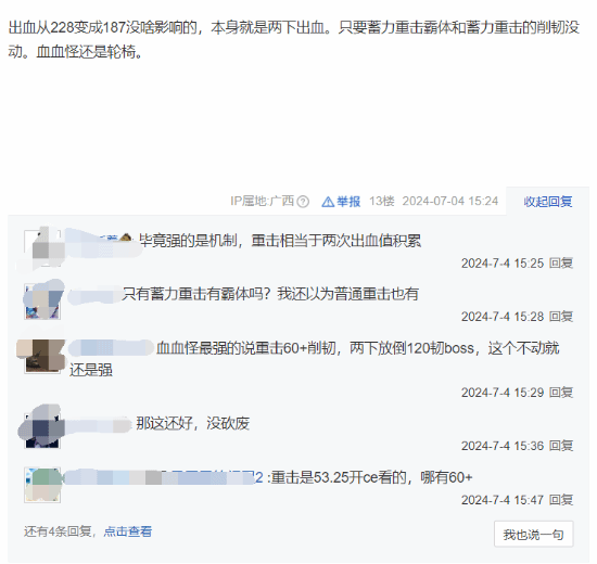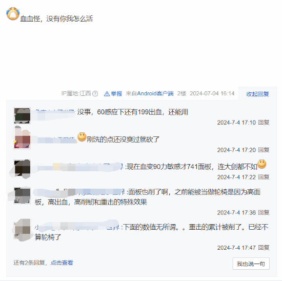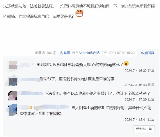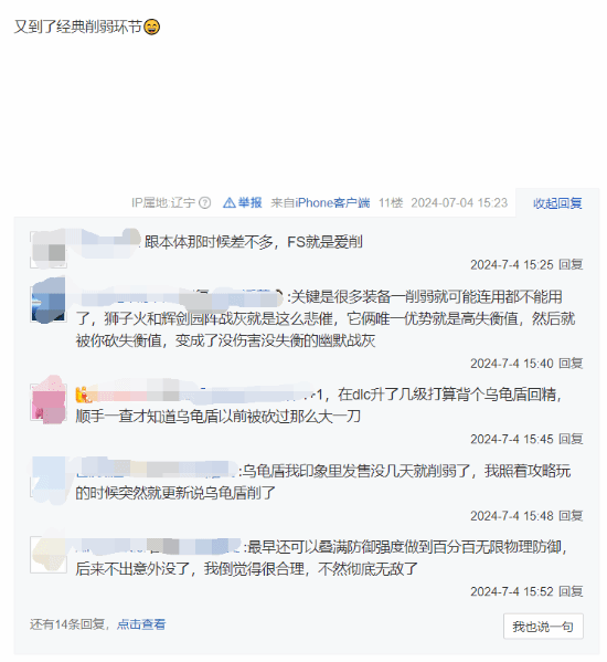 也有玩家冷静分析后指出,本次大削的其实只有串联火花香,血血怪手臂并没有伤到筋骨,拒绝的刺也幸免于难,法爷还是很强。还有玩家认为轮椅确实该削,但一些boss也该削,这样难度才正常。