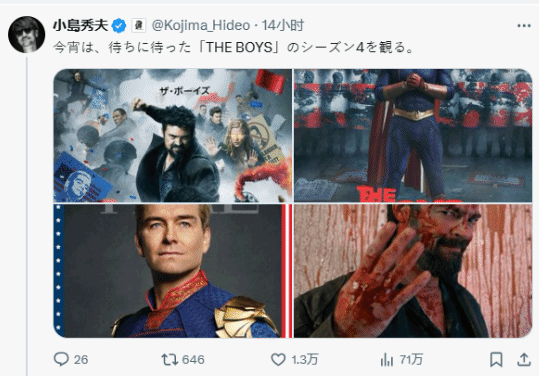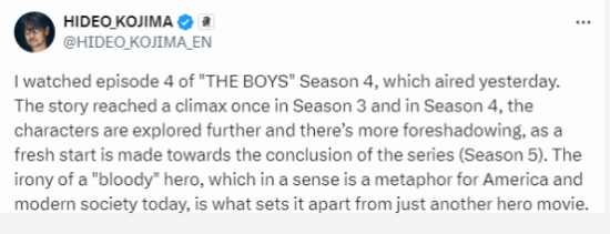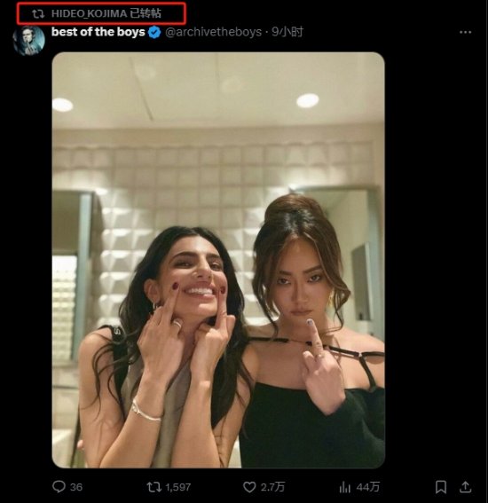据相关消息,《黑袍纠察队》官方于近日在社交平台上发布了“爆头女”和喜美子的演员合照,而小岛秀夫随后直接进行一个转发,据了解,其还在此前称赞过第四季第四季讽刺意味很足;在第四季开播前,小岛还发推称“今晚,我们将观看期待已久的《黑袍纠察队》第四季”,可以说是真爱粉了。