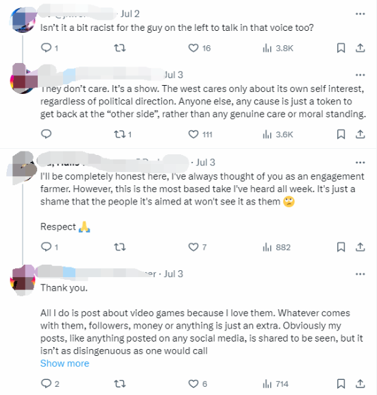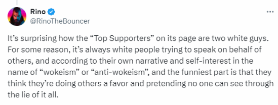 知名游戏推主Rino对此非常不满,他指责白人“总是试图代表别人说话”,打着觉醒主义或反觉醒主义的旗号做符合自身利益的事。“他们在撒谎,以为自己在帮别人的忙,还假装没人能看穿。”