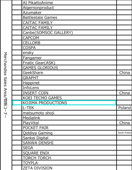 值得一提的是,展会名单的小岛工作室被划分到了Merchandise Sales Area(周边产品量贩区),届时或会以周边产品的展示与贩卖为主,请玩家们谨慎看待上述传言。
