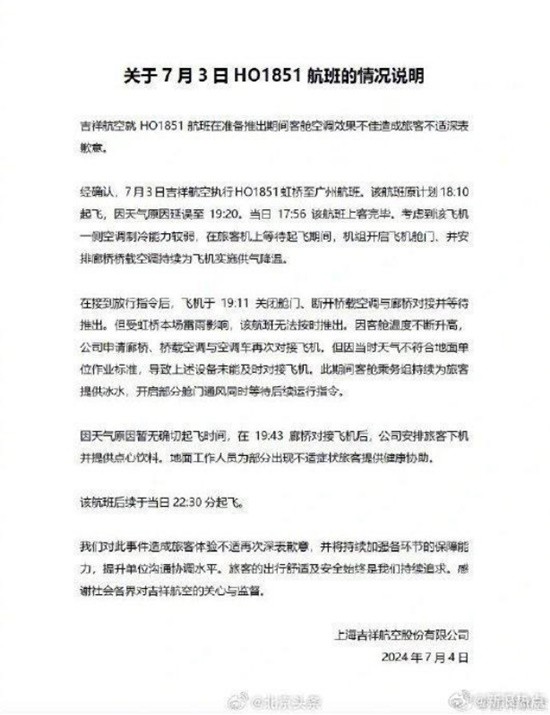 据相关消息,吉祥航空于近日发布了最新情况说明,该说明称,经确认,7月3日吉祥航空执行HO1851虹桥至广州航班。该航班原计划18:10起飞,因天气原因延误至19:20。当日17:56该航班上客完毕。考虑到该飞机一侧空调制冷能力较弱,在旅客机上等待起飞期间,机组开启飞机舱门、并安排廊桥桥载空调持续为飞机实施供气降温。