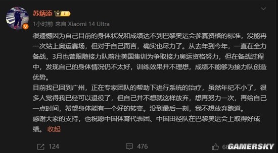 据悉,为了即将到来的巴黎奥运会,中国男队已于此前前往意大利备战,而据相关消息。苏炳添由于伤病导致训练不系统,身体状况无法持续进行高强度训练,固将缺席巴黎奥运会,但他于近期在社交媒体上发文表示自己不会离开赛道,将继续奔跑。