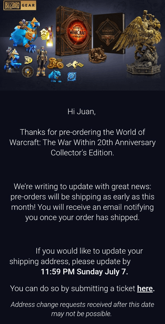 据了解,随着距离《魔兽世界》最新资料片《地心之战》上线的日子越来越近,玩家们最常问的问题之一便是该资料片的实体收藏版何时发货,而据Twitter用户@gummerpaladin的消息,暴雪Gear Store已经向购买了《魔兽世界:地心之战》收藏版的玩家发送了通知,告知他们收藏版将在本月内发货。