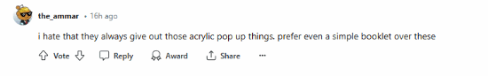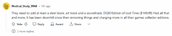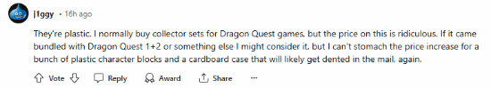 “我通常会为《勇者斗恶龙》游戏购买典藏版,但这次的价格太荒谬了,如果它与《勇者斗恶龙1 2》或者其他的东西捆绑在一起售卖,那我有可能会考虑它,而且我也无法忍受一堆亚克力块和一个典藏外箱的价格,这些东西可能会在运输的同时被损坏。”