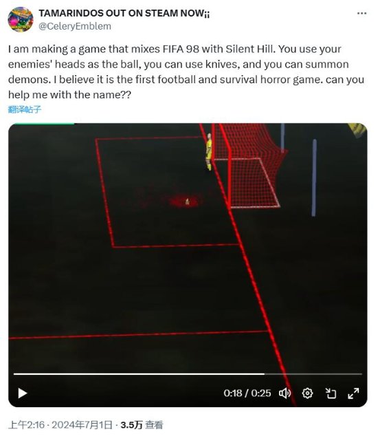 据相关消息,独立开发者@Celery Emblem于近日在社交平台上表示自己正在制作一款将《FIFA 98》和《寂静岭》结合的足球游戏,并分享了该游戏的一段演示,从演示中可以看到,球场上的球员们将一颗头颅当做足球踢,玩家还可以看到从这一颗头颅中喷溅出的红色液体。