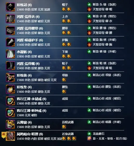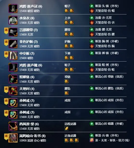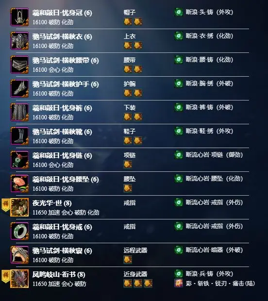 常规竞技场毕业装,苍云与会心联动属性少,因此选择主破,提高buff破防收益。