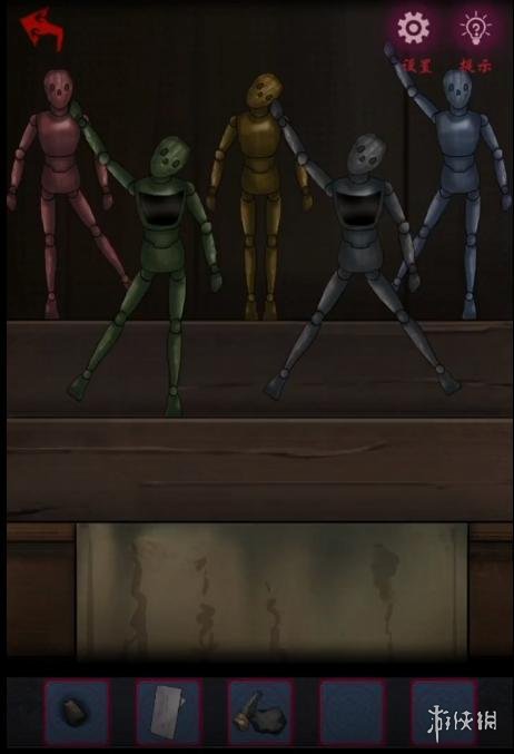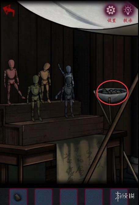 将【木炭】放到下图所示位置,将两个人偶调整到下图的姿势即可获得【纸条】和【打火石】,桌面上获得【秤砣五】,桌角下左边获得【引火棒】右边【未点燃的灯笼】,根据花盆的提示输入文字密码【储記信堵】,得到【摆件塔】,放置摆件,根据图上信息得知桌面上盒子的密码是【41326】,得到【话本】