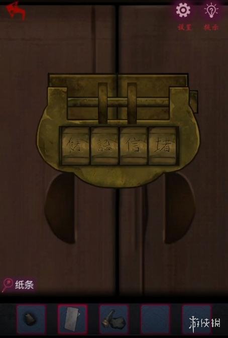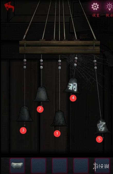 道路开启后,在桌上获得【瓷器】,根据门上的画在墙上的砖块后输入密码,打开获得提示,按照下图顺序【商徽角羽宫】,获得【钥匙】,使用即可打开门。