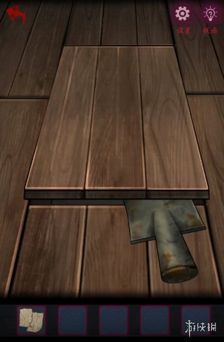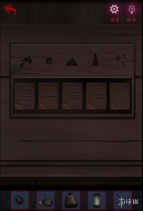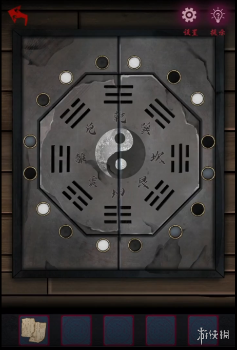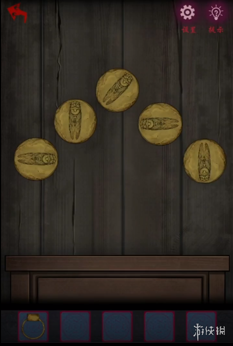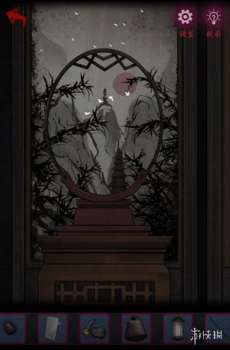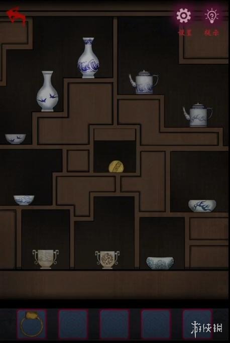 在左边柜子上获得【把手】,右边获得【油灯】,使用油灯在右边柜子下点亮获得【玉器】,挂画的后面获得【驱虫粉】和【账簿】,使用驱虫粉赶走左边柜子下的虫子获得【花瓶】,将花瓶玉器瓷器按照下图进行摆放获得【蝉摆件】,把蝉放到左边的墙上,旋转到下图位置,打开暗门。