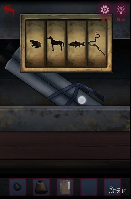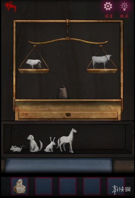在门外挂上灯笼,使用打火石点燃木炭,引火棒点燃4个灯笼,开始猜灯谜,根据【坐立行卧】打开下方桌子的盒子密码得到【画】,将话本和画交给客栈老板获得【印章】和【兔子】。根据秤砣和几种动物的重量,得知每个动物代表的数字,调整位置放上印章即可。