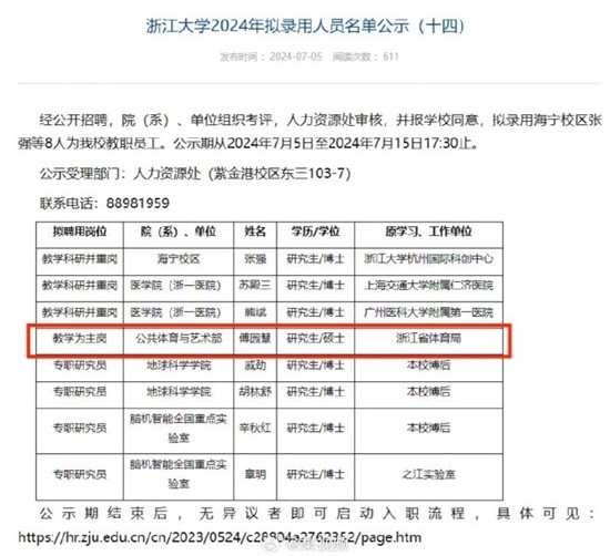 据了解,浙江大学官方于近期公示了2024年拟录用人员名单,这份名单显示,傅园慧将入职公共体育与艺术部,教学为主岗位,而浙江大学公共体育与艺术部接线工作人员也于近日表示,名单中的“傅园慧”是中国国家女子游泳队运动员,游泳世界冠军傅园慧。