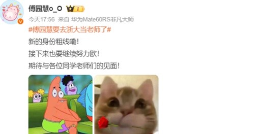 傅园慧在个人账号回应:“傅园慧要去浙大当老师了,新的身份粗线(出现)嘞!接下来也要继续努力欧!期待与各位同学老师们的见面! ”
