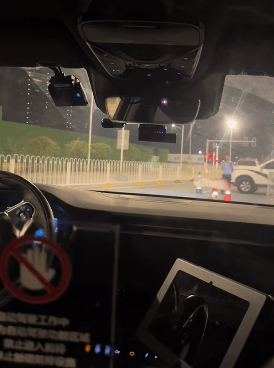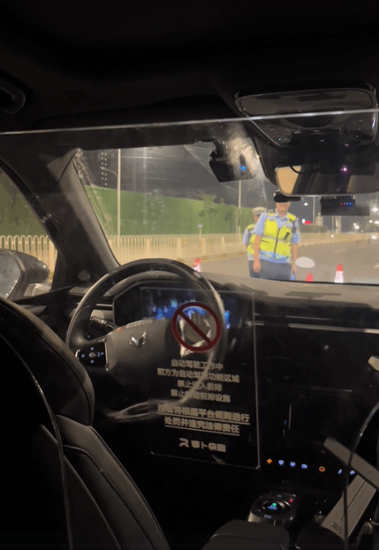 他们搭乘的这辆萝卜快跑无人出租车,看到警察查酒驾后,配合交警摆放的锥桶行驶,但当交警发现是无人驾驶出租车后,就没有阻拦,直接放行通过。
