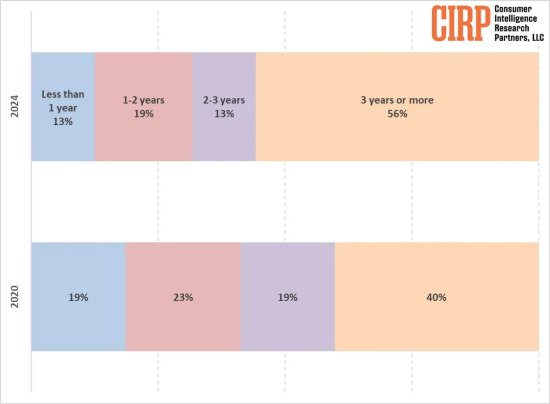 据相关消息,消费者情报研究合作伙伴(CIRP)于近期在社交平台上公布了最新数据,数据显示,在最近12个月中,至少71%的iPhone用户和68%的Mac用户称其旧设备使用时间已超过两年,而2020年这两个比例分别为63%和59%,由此看来,随着换机周期的放缓,苹果用户持有设备的时间正变得越来越长。