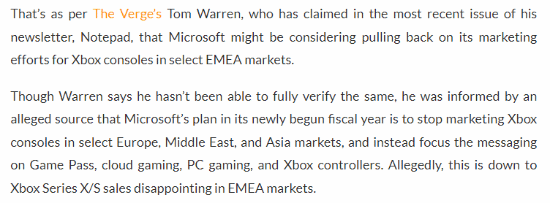 据相关消息,The Verge的知名记者Tom Warren于近日在社交平台上发布了最新爆料,其透露微软可能正在考虑在部分欧洲、中东和非洲市场停止营销Xbox主机,他表示,虽然他目前无法证实这一情报,但一位消息人士告诉他,微软因欧洲、中东和非洲市场的主机销量令人失望,其新财年的计划是将重点放在XGP、云游戏、PC游戏和Xbox手柄上。