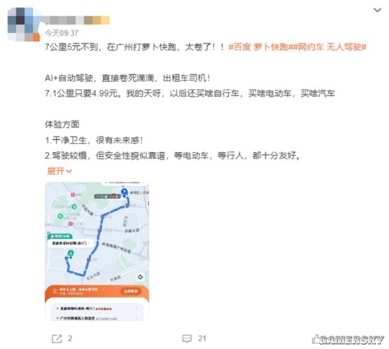 有网友分享了在广州使用萝卜快跑的体验,直呼太卷了,比如:“7.1公里只要4.99元、干净卫生、完全按照导航地图规划”等等。