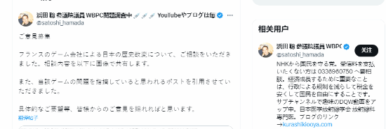 据了解,日本参议院议员滨田聪在推特上回应了玩家们的发声,表示自己收到了一家法国游戏公司篡改日本历史的问题咨询,将就此事做出调查,并可能会向日本立法机构和日本国会提起育碧及其即将推出的游戏《刺客信条:暗影》:原因是其改变了日本的历史、建筑等,并可能使用了人工智能生成游戏所设定的时间段的图像。