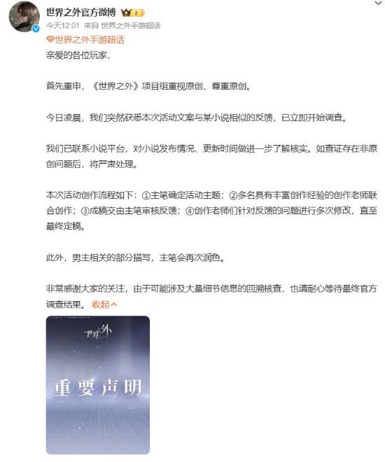 《世界之外》官方表示:“项目组重视原创、尊重原创,获悉情况后已立即开始调查。如查证存在非原创问题后,将严肃处理。”