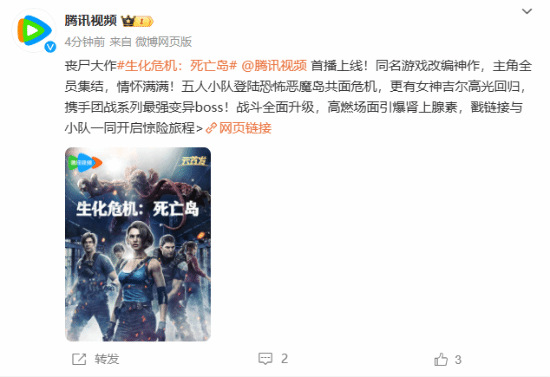 以上,便是小编收集到的有关《生化危机死亡岛》上线腾讯视频的全部内容,感兴趣的朋友们可以关注一下,那么,让我们下期再见。