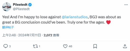 据外媒gamesradar报道,在开发之星宣布获奖者之前,《地狱潜者2》总监Pilestedt曾表示今年的大会是一场激烈的竞争,并表示自己既兴奋又紧张。而在奖项名单公布后,尽管《地狱潜者2》未获得最佳游戏奖,但Pilestedt表示箭头组很高兴输给拉瑞安,《博德之门3》是真正能让人铭记的作品。