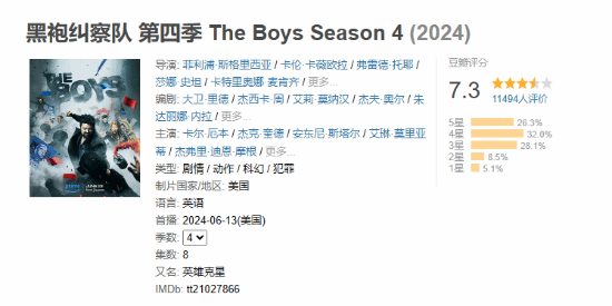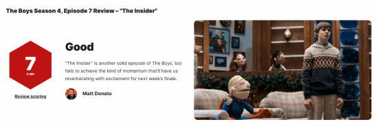 据了解,剧集《黑袍纠察队 第四季》目前在豆瓣的评分为7.3分,共有11494人参与评价,其中给予5星、4星及3星的剧迷居多,分别占比26.3%、32.0%与28.1%,而该剧的第七集“The Insider”已于近日播出,而IGN本次为这集打出了7分评价,让我们一起来看看IGN是怎么评价这集的吧。