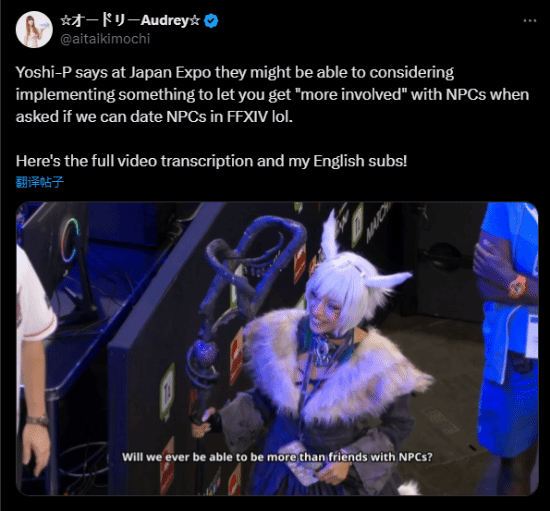 当被问及《最终幻想14》玩家是否可以在游戏中与NPC的关系更进一步,“超越”朋友的关系去进行一些约会时,吉田表示虽然开发人员必须遵守主线剧情,但他思考过相关问题,例如粉丝喜爱的角色埃斯蒂尼安是否会突然出现在某个随机的星球上,并设想可能会发生什么。吉田没有给出准确回答,不过他表示未来可能会出现更多玩家与NPC的互动。