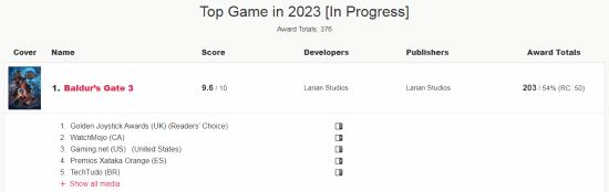 Game of the Year网站显示,《博德之门3》是去年获奖最多的游戏,总奖项数达到了惊人的203个,其中包括TGA年度游戏、金摇杆奖年度游戏、Steam年度游戏等等。如此频繁地出席颁奖活动,也难怪Larian的开发工作会受到影响。