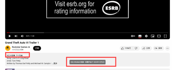 据ResetEra上的一名用户发现, Youtube上《GTA6》官方预告片的观看次数现已超过2亿次。截至撰写本文时,该预告片的观看次数已达200,189,866次,仅用了7个多月的时间就达到了这一里程碑。