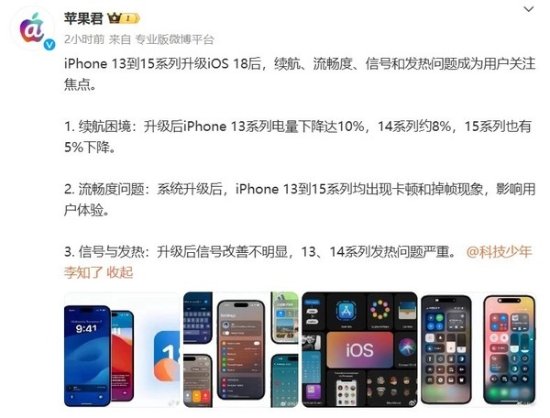 据了解,iPhone133到15系列的系统已于此前升级到了iOS 18,而鉴于新系统可能存在的软件错误和其他潜在问题,其续航、流畅度、信号和发热问题成为用户关注焦点,让我们一起来了解一下吧。