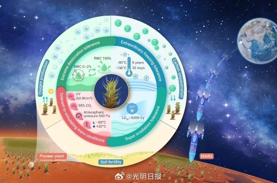 研究还发现,在复合多重逆境的火星模拟条件下,齿肋赤藓仍能存活并在恢复适宜环境后再生出新的植株。这也是高等植物在火星模拟条件下存活的首次报道。这意味着,齿肋赤藓有望成为首批登陆火星的地球生命体。