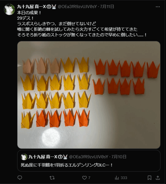 这位玩家每死亡一次就折一只千纸鹤,每天都会分享千纸鹤的照片,并且配上自己的游玩感言或是吐槽,例如“今日的战果!死了29次!虽然没打败这个看起来像最终BOSS的家伙,但是试了一下传说中的【拒绝的刺】。火力很强!让我看到了希望。折纸的存货快用完了,希望能早点打败它...”