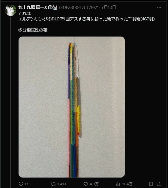 就在前天(7月13日),他终于通关了DLC,累积死亡467次,所以也折了467只千纸鹤。(说实话还挺厉害,小编感觉自己双月骑士 米塔恩就死了这么多qwq)他将所有千纸鹤拼起来做成了一条长鞭,还开玩笑说“可能是圣属性的鞭子。”