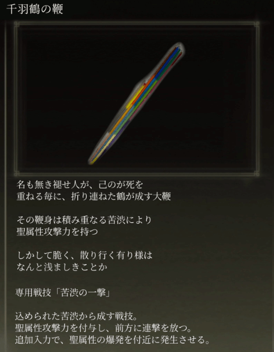 还有热心网友帮他P了很有《法环》风格的武器展示图,制作了一款名叫【千纸鹤之鞭】的圣属性武器。