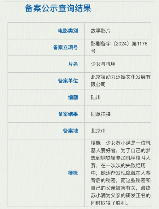 据相关消息,由陆川编剧的电影《少女与机甲》已于近期正式备案立项,而国家电影局关于2024年5月下全国电影剧本(梗概)备案也披露了该电影的部分信息,让我们一起来了解一下吧。