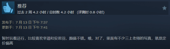 给出好评的玩家认为,本作的规格在一众同类游戏中属于高的,算上三上悠亚在内,目前共有8位女性角色可攻略,流程内容还是不少的,也有一些小游戏可以让玩家换换口味,同时参演的妹子们颜值也都还不错。