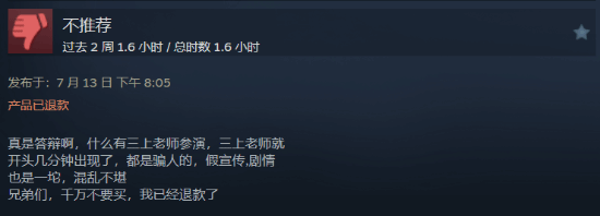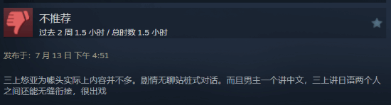 给出差评的玩家指出,本作以三上悠亚为卖点,但实际上三上的戏份并不算多,定价在同类游戏中也算高的。此外,游戏中仍有一些Bug需要修复,影响了玩家体验。