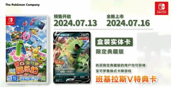 除了数字版外,本作还将推出盒装实体卡限定典藏版,凡购买限定典藏版的用户均可获得宝可梦集换式卡牌游戏班基拉斯 V 特典卡一张,数量有限,售完即止。
