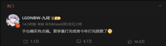 据相关消息,王者荣耀职业联赛KPL于此前公布了“梦之队大名单”后,来自LGDNBW俱乐部的电竞选手九尾发文承认手伤,据了解,九尾曾获得过2021年KPL春季赛亚军、KPL秋季赛亚军、王者荣耀挑战者杯亚军,2023年2023微博年度人气电竞选手,其在社交平台行表示,打完夏季赛或者下半年比赛就可能会退役。