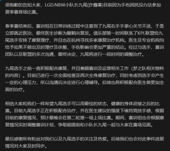 今年6月,LGDNBW俱乐部曾发文公布了九尾的手部伤情。