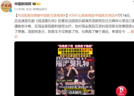 以上,便是小编收集到的有关法国演员感谢中国医生拔鱼刺的全部内容,对此事感兴趣的朋友们可以关注一下,那么,让我们下期再见。
