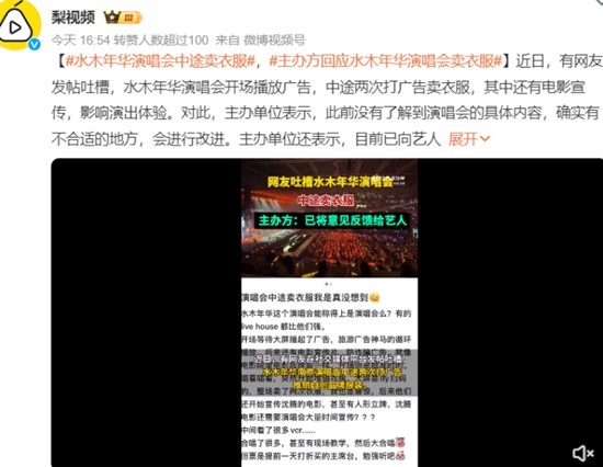 据相关消息,有网友于近期在社交平台上发帖吐槽水木年华演唱会开场播放广告,此外,整场演唱会中频繁出现的植入广告也成为了观众诟病的焦点。从舞台背景到现场大屏幕,从节目间隙到互动环节,广告无处不在,严重影响了观众的观演体验。有观众直言:“这哪是来看演唱会的,简直是来看广告的!”