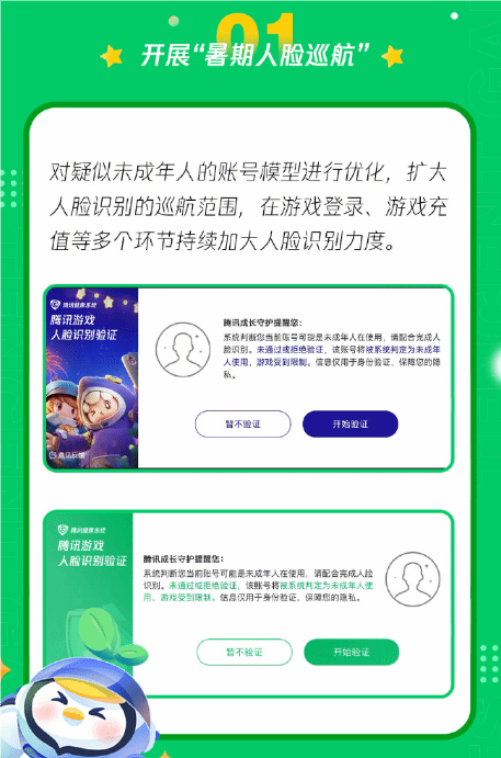 首先,“暑期人脸巡航”将对疑似未成年的账号模型进行优化,扩大人脸识别范围,加大游戏登录、充值等环节人脸识别力度。